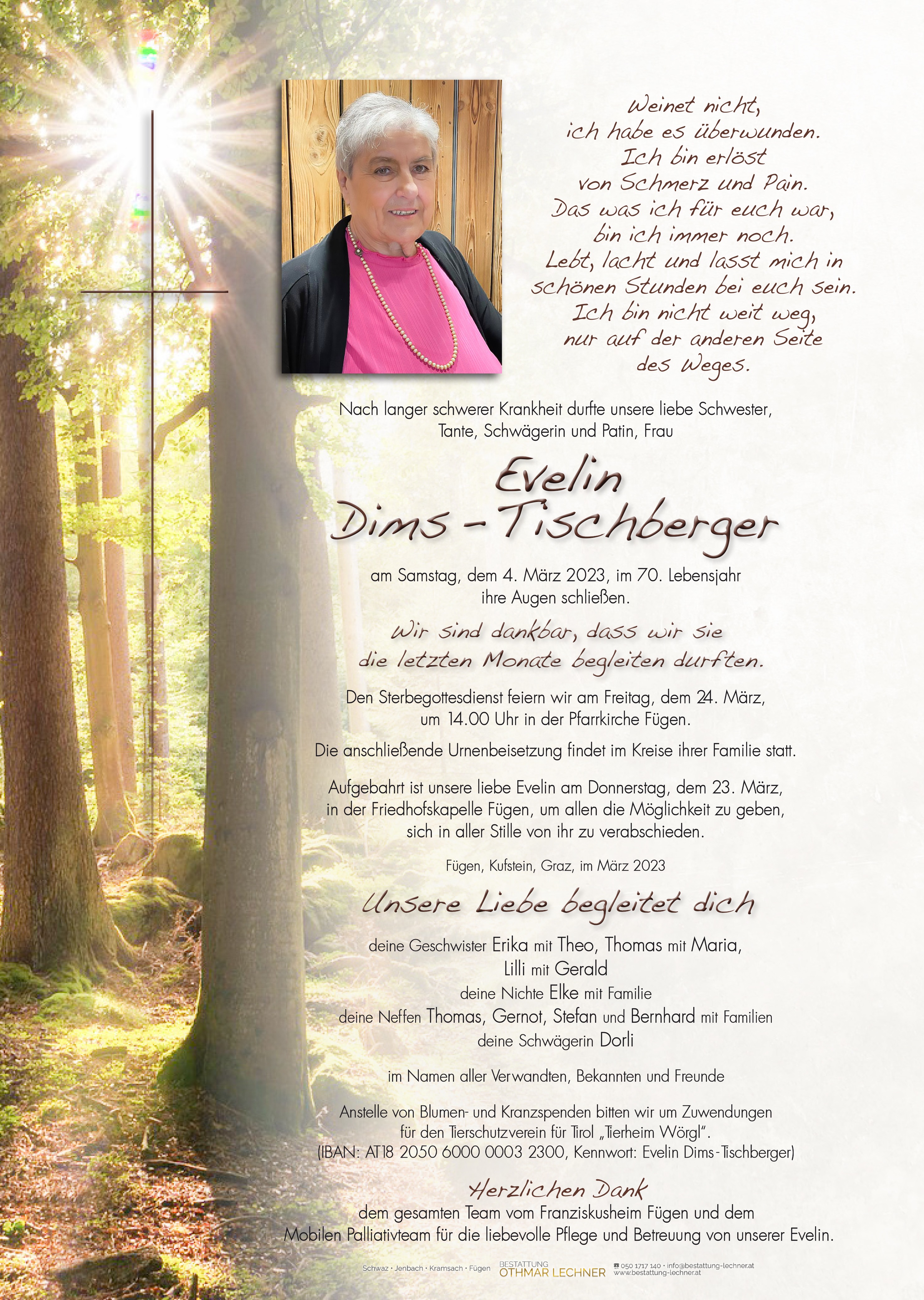 Deine Sieglinde Liebste Evelin, nun hast du die irdische Heimat verlassen. Findest dich wieder im göttlichen Licht und in der Liebe geborgen. Morgen kommt und Abend wieder. Kommen immer, immer wieder. Aber niemals wieder du. Einfach danke für dich!